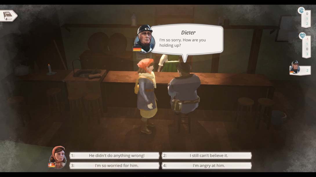 竭尽全力,尽最大可能利用你的性格点数,你的忠诚与你的资源。你与不同角色与派系之间的关系将影响你的故事。在日记中反思过去的经历,获取性格技能点数并提升格尔达的精神力技能。在事件中与对话中利用技能解锁特殊动作,获取他人的信任或者是避免被怀疑。