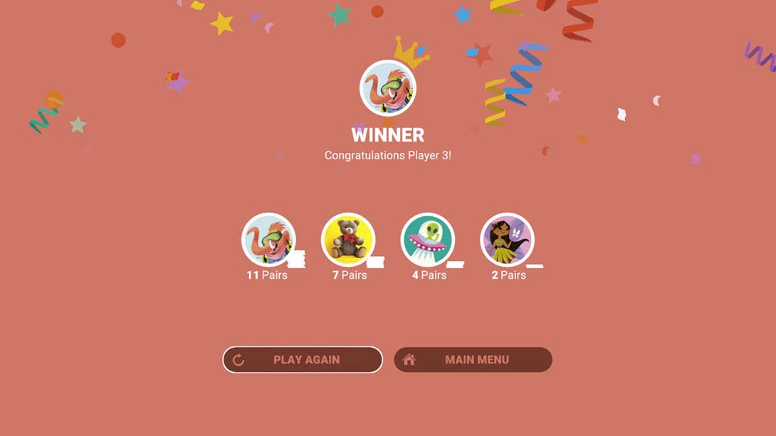 拿起两张卡:如果他们匹配,你保留他们,并可以发现另外两张卡。如果他们是不同的,他们就留在游戏中,然后轮到下一个玩家。最后纸牌对数最多的玩家就是赢家!