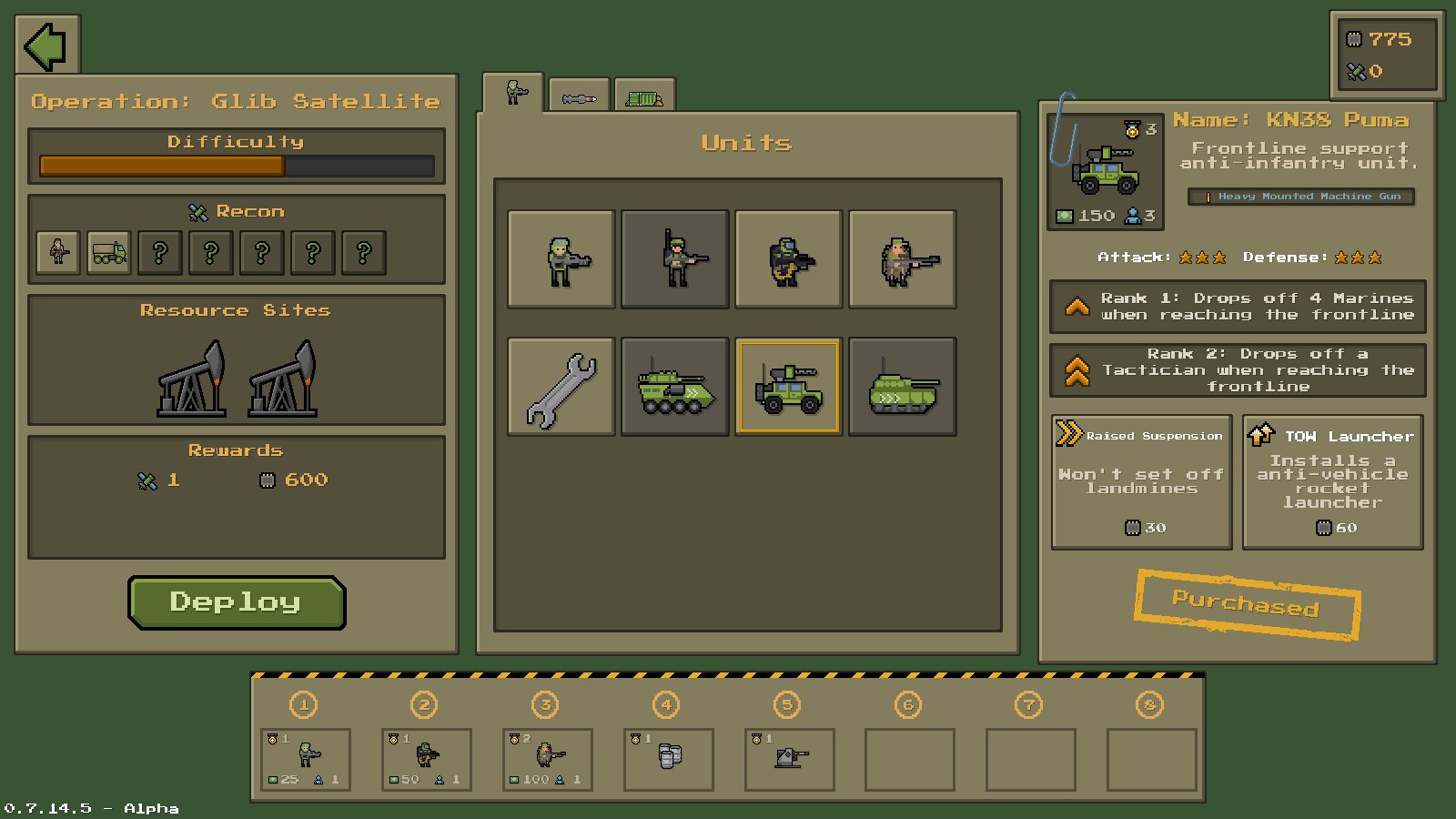 《小兵大战》是一款易于上手但极有深度的拉锯战式终极战略游戏。在这款以战略为重点的战斗游戏中,要正确部署士兵、坦克、直升机和飞机的编队。组成最好的军队,研究正确的技术;征服你的敌人!