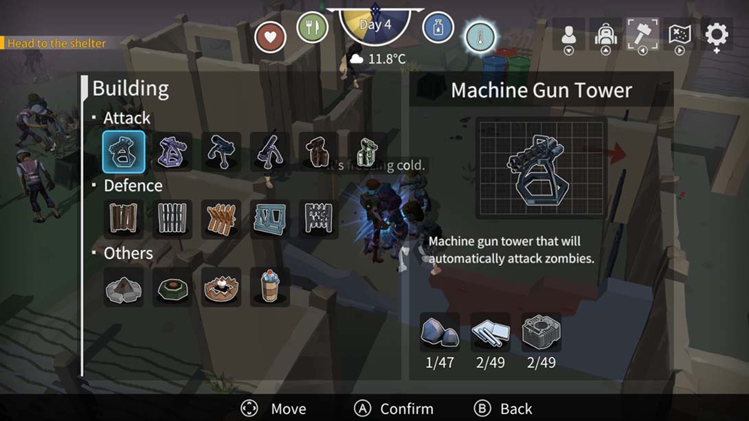 夜晚才是真正的战场!夜晚的僵尸行动力极强,白天时玩家到处搜集建筑的材料,以及武器装备,在夜晚来临前,建设各种防御类型、攻击类型的设施,以迎接夜晚的僵尸大军。