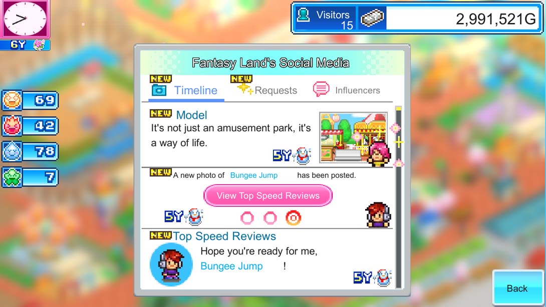 访问者对你印象越深刻,你获得的积分就越多。这些可以用来研究新的景点和固定装置,或者为现有的景点和固定装置添加新的功能。给你的粉丝一个他们永远不会忘记的体验,并通过排名来提升你的排名!