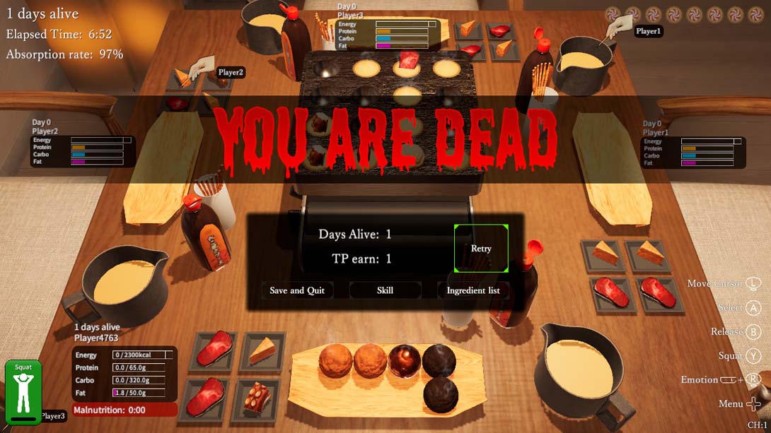 你应该摄入均衡的蛋白质、碳水化合物和脂肪才能生存。营养平衡会根据您在章鱼烧中放入的成分而变化。如果热量超标,就会吃得太饱,所以请通过蹲着来消耗热量。