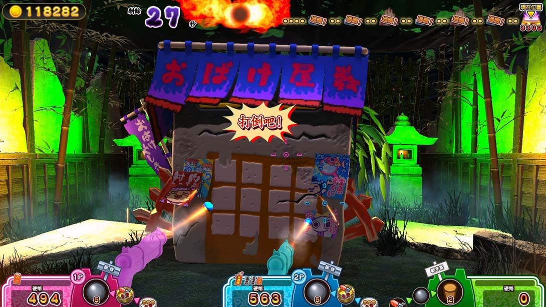 在硬幣模式的射擊屋場景中,仔細瞄準排在正面的獎品並將其擊落,就能獲得獎品上數字的硬幣。此外只要擊落有妖怪躲藏的獎品,妖怪就會現身並襲擊而來,射擊並將妖怪消滅吧。射擊屋場景中共有24種讓獎品升降或旋轉等各式各樣的機關。