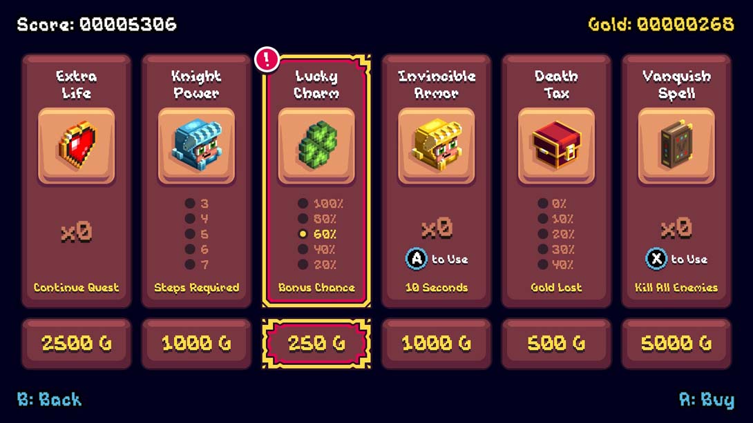 -升级商店,特色:额外的生命,骑士力量增加,幸运符,无敌盔甲,死亡税减少,和毁灭性的征服法术。