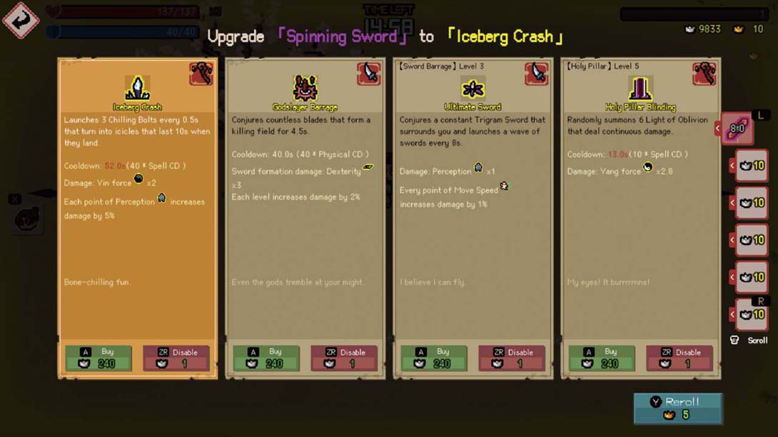 每一次升级都可能让你从窝囊废变成英雄!花费黄金来重新滚动你的技能选择!哦,并以天赋点的形式获得元进度,使您的运行更容易!