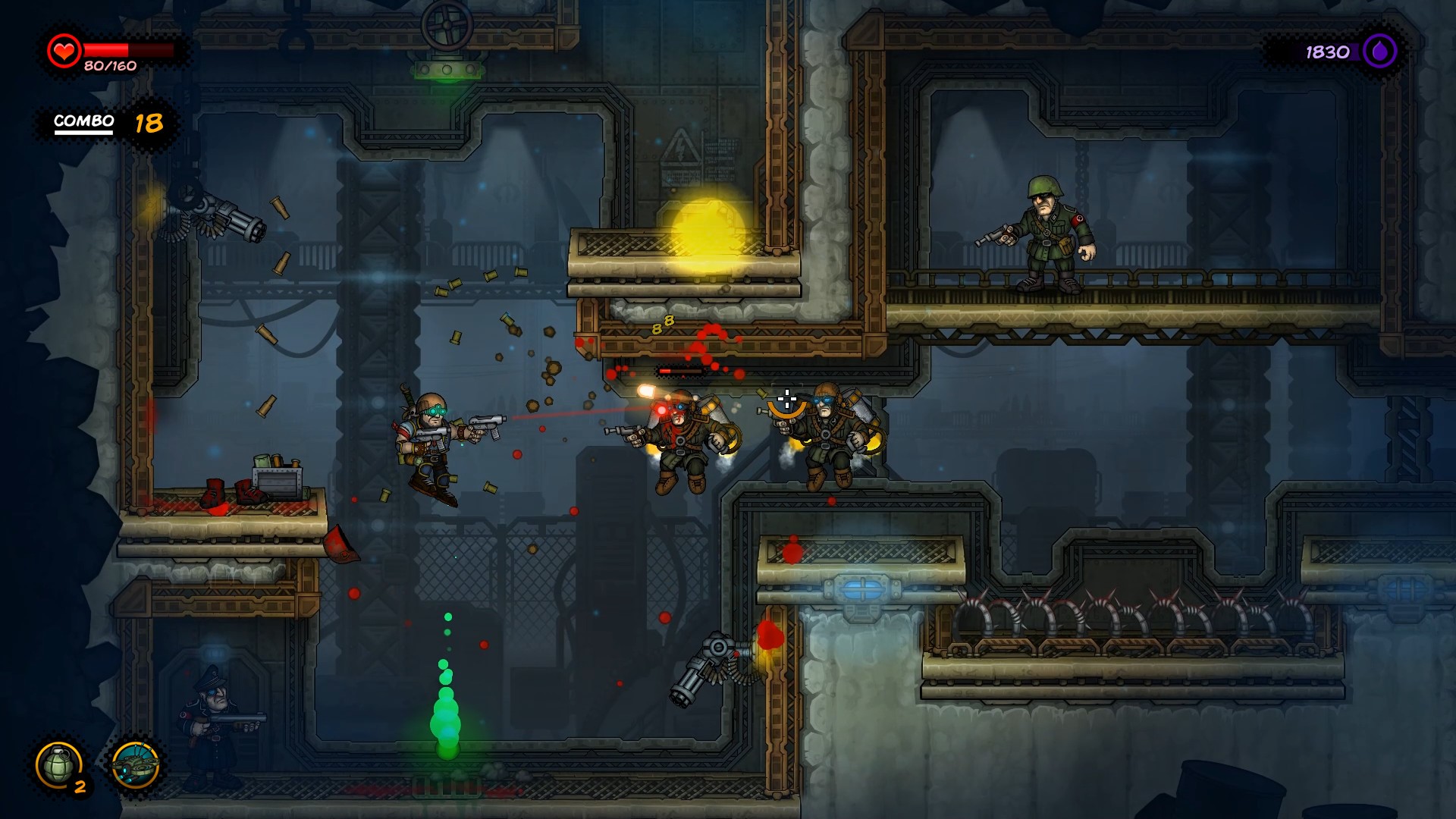 360°射击的平台动作游戏。像个真正的硬汉一样跳跃、冲刺、射击、斩击并把敌人炸上天吧!