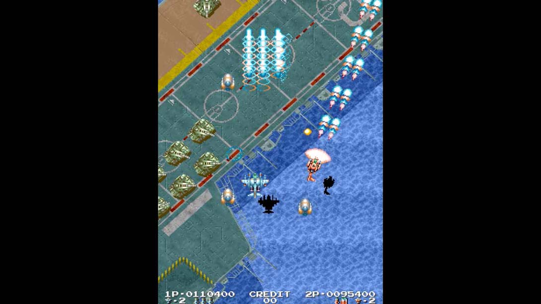 “空气决斗”是1990年发售的街机游戏纵向滚动射击游戏。各关卡开始时可以选择战斗机类型和直升机类型两种自机是其特征,由于攻击方法各不相同,因此选择符合关卡特征的机体对攻略关卡非常重要。可以说是ailem作品的共同特征的缜密美丽的2d图形在本作中也依然存在,未来感的稍微阴暗的机械的描写有独特的魅力。适合两个人同时玩。