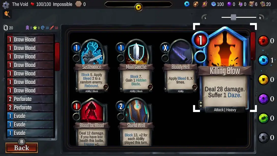 以最简单的「劈砍」为例,它将造成5点伤害。镶嵌上黄色虚空石后,打出这张牌还能获得4点格挡。或镶嵌蓝色虚空石,这张牌就能“抽一张牌。丢弃一张牌”。有无数的组合待你尝试,而这些交互是游玩之乐和学习的一部分。