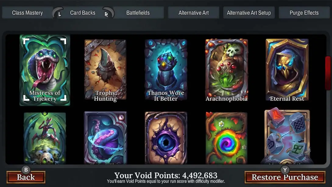虚空穹牢中最独特的功能之一是能自定义卡牌。你会在游戏过程中收集虚空石,并将其镶嵌到任意牌里,从而增强卡牌效果。