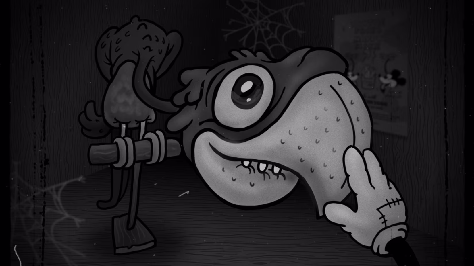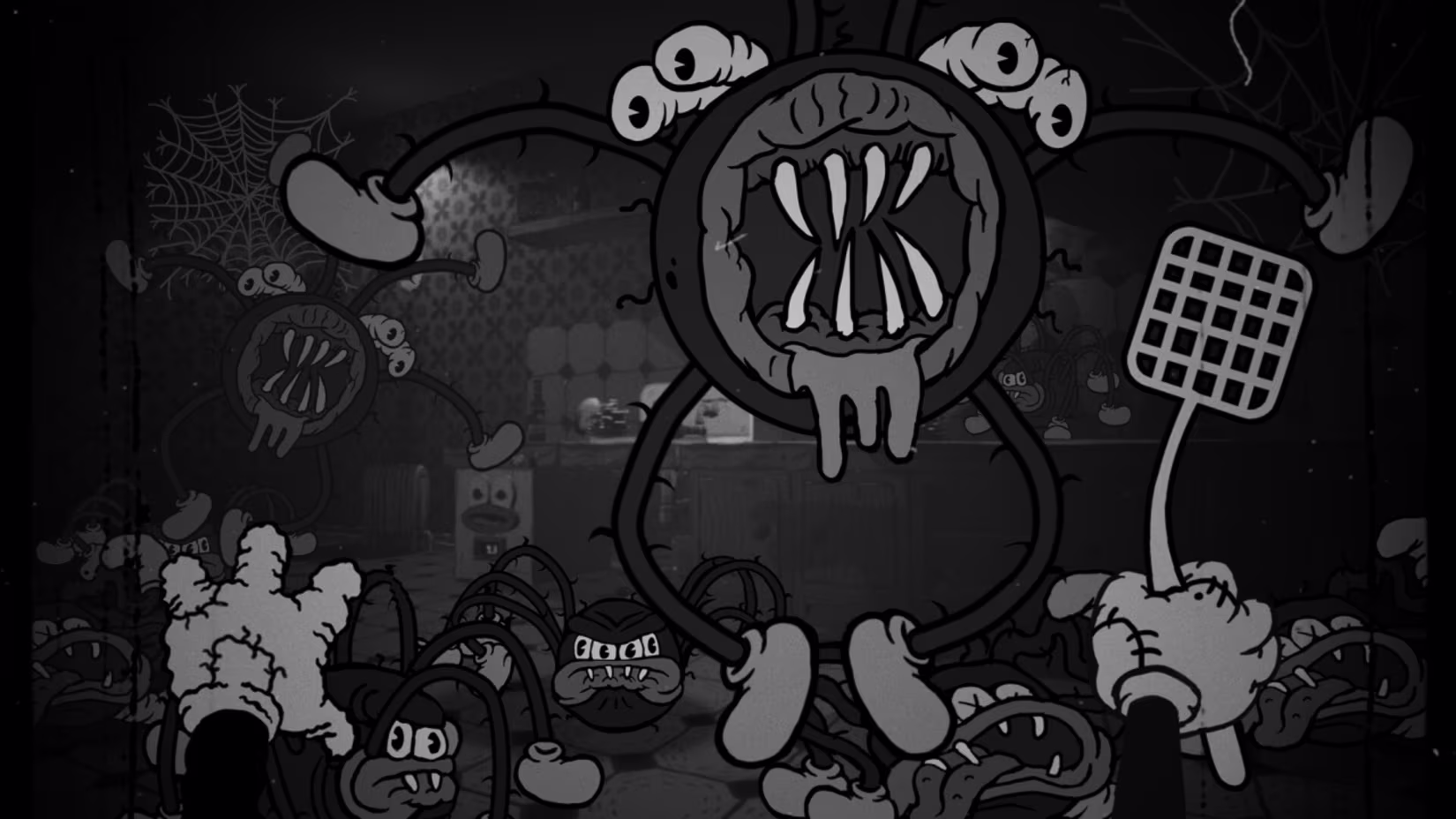 游戏采用黑白橡皮管动画风格(类似《茶杯头》),场景设计充满超现实扭曲感,房屋角落、天花板等细节暗藏恐怖元素,营造出强烈的心理压迫。