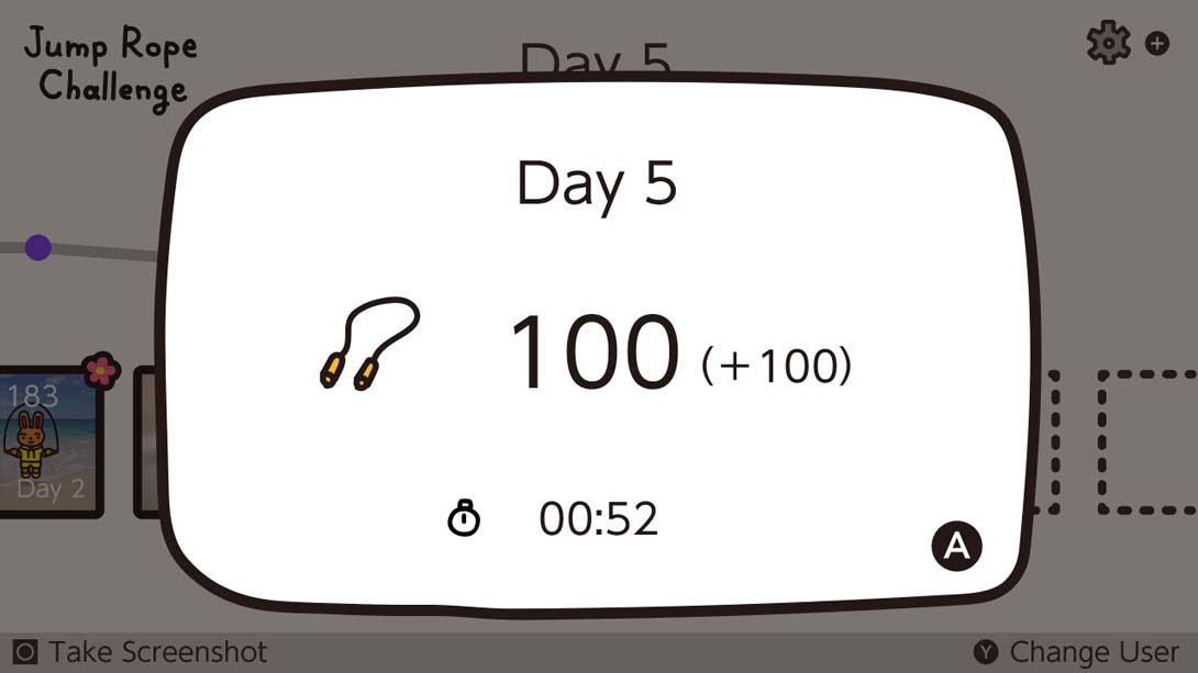 游戏玩法就像它的画面一样简单,玩家只需要拿起Joy-Con,像跳绳一样转动双手,根据自己的节奏跳动即可。玩家还能够一一日跳100次或更多次为目标进行锻炼。