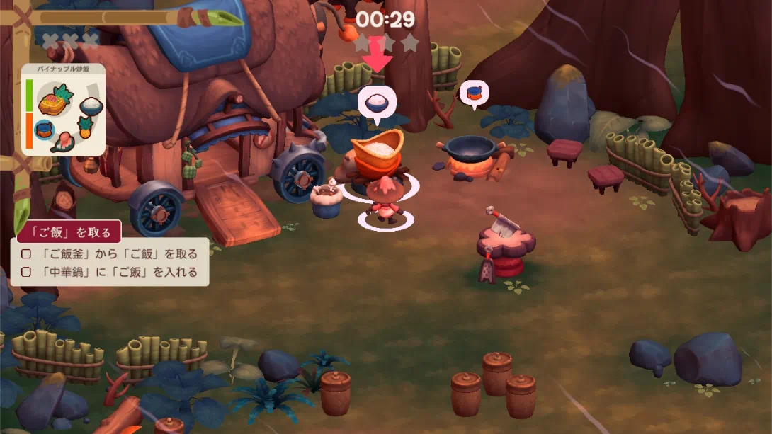 结合时间管理烹饪(如制作东南亚特色料理)与实时战斗(对抗野猪等野兽),需平衡食材收集与烹饪节奏。