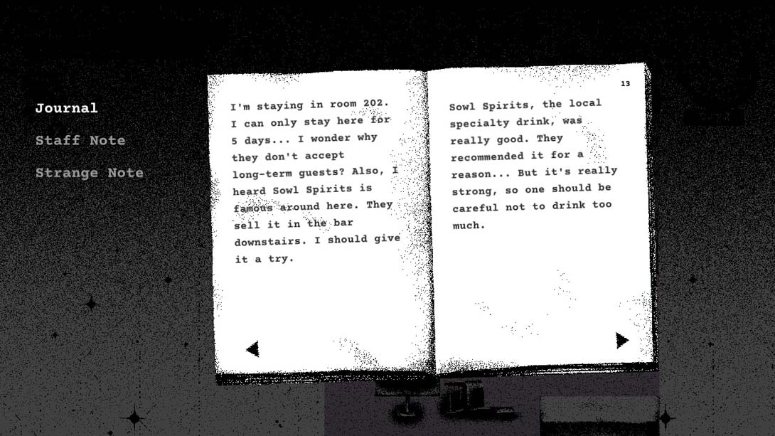 《Hotel Sowls》是一款黑白画风的点击式冒险解谜游戏。在游戏中你将扮演一名药师,经过一段艰苦的旅程,你设法得到了一块珍贵而神秘的石头,你决定在猫头鹰旅馆休息一下。但第二天早上,有人在酒店偷了石头!你能在这个陌生而又神秘的酒店里找到一块石头,找到酒店的秘密吗?