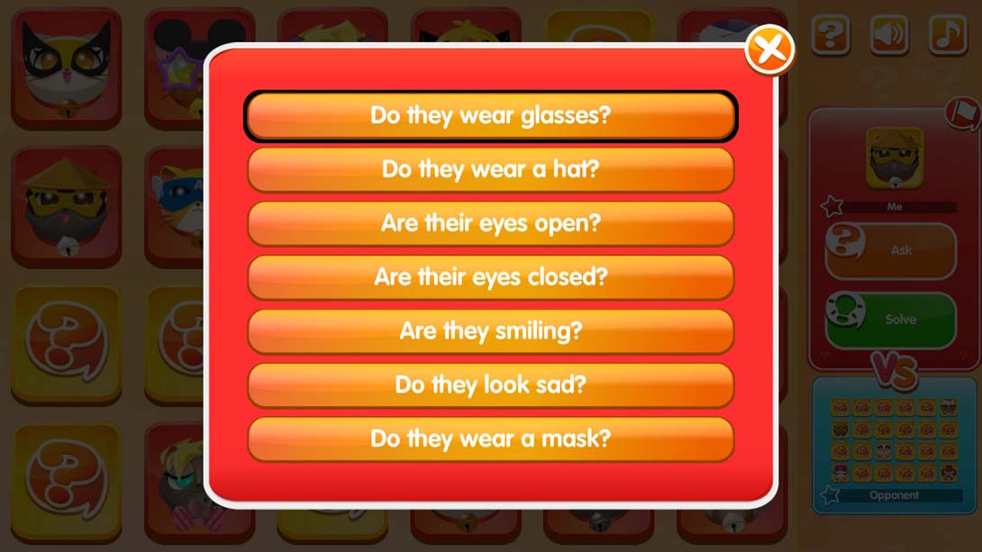 玩家轮流询问各种是或否的问题以消除候选人,例如“这个人戴眼镜吗?”。