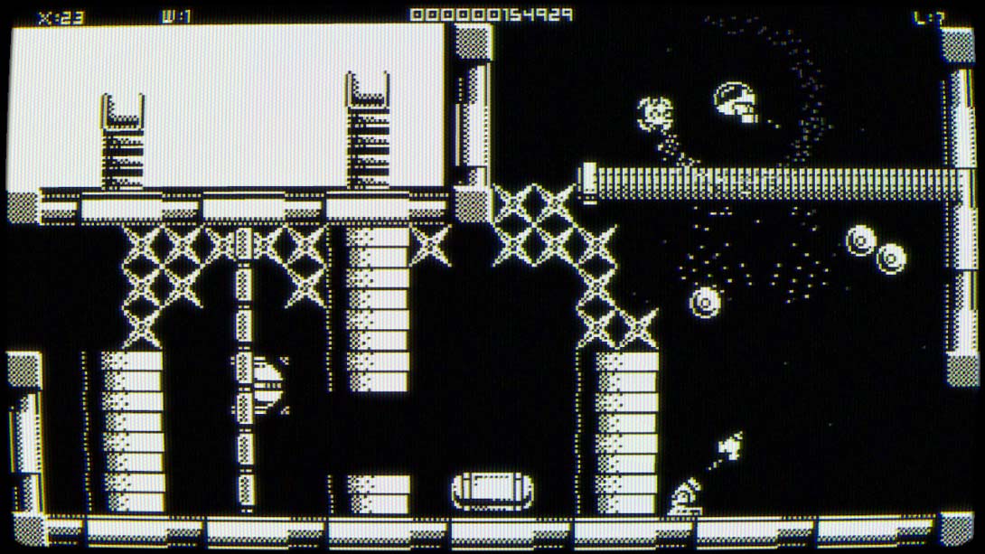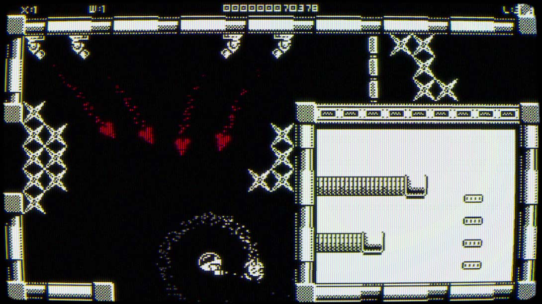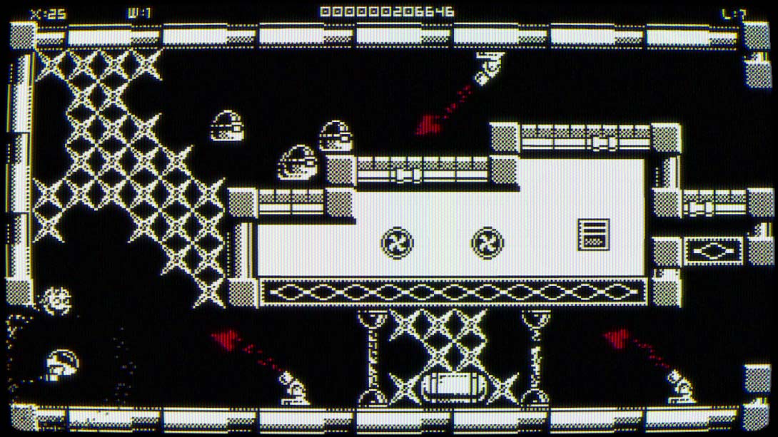 switch《Cecconoid》是一款黑白风格的动作射击游戏。游戏有着经典射击游戏的多种元素,弹幕、双摇杆射击、8bit像素风格,相当old school,除了相当危险的红色碎片弹幕外,其他画面都是由黑白构成,足够简洁。