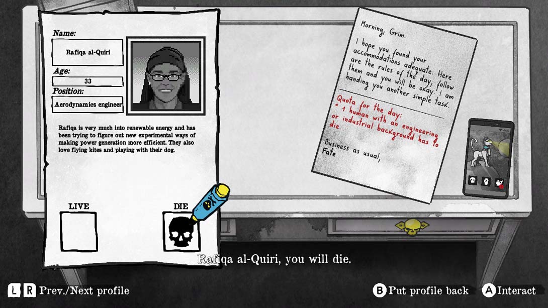 switch《死亡税 Death and Taxes》是一款2D叙事类独特风味的冒险解谜游戏。在游戏中你将扮演办公室中的死神,你的工作是确定哪些人将生存或死亡,但是如果误判了,你就要承担相应的后果。
