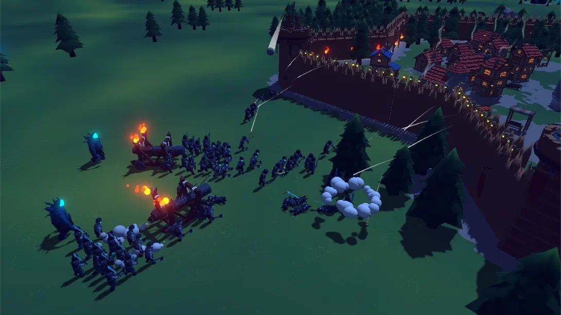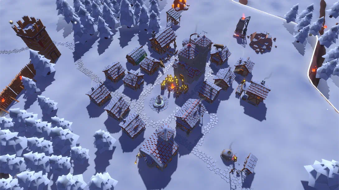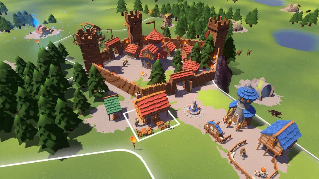 昼夜循环机制:白天收集木材、石材等资源,建造住房、农场、锯木场等设施;夜晚部署士兵、哨塔、弩炮等防御单位,应对敌人波次进攻。