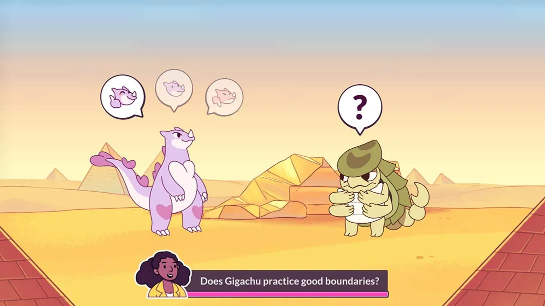 怪兽通过一种破坏性的求爱仪式来交流。恋爱兴趣会让吉吉楚问一些比较兼容性的问题,你们的关系会变得更强或更弱,这取决于你们的答案匹配得有多好。每只怪兽都是不同的,所以作为Gigachu,你需要更多地了解其他怪兽,并在每次约会中应用这些知识。