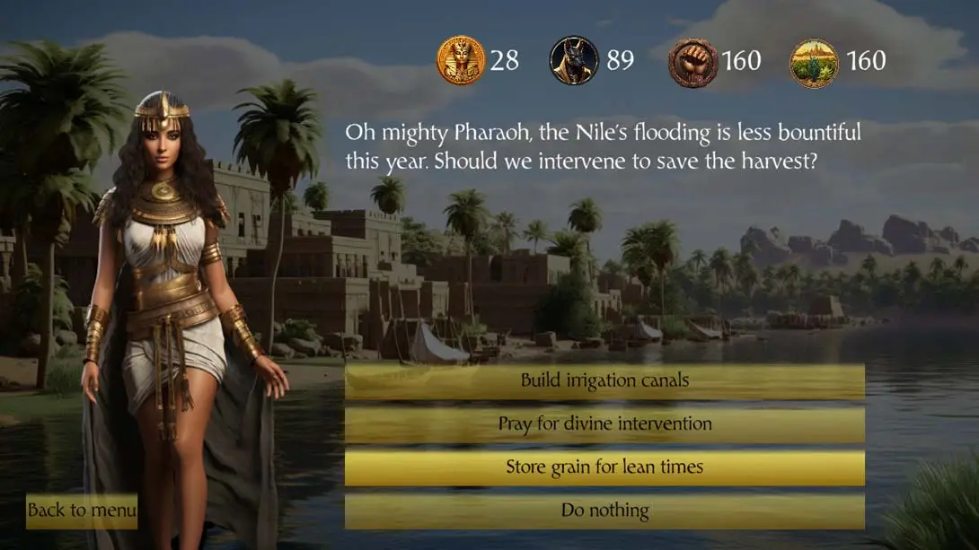 穿上古埃及法老的金凉鞋,带领你的帝国穿越时间的沙漠。解决你的臣民的各种问题,从国家事务和精神困境到宫廷阴谋和浪漫。你的决定要么会积累财富,增强经济,用宏伟的寺庙和金字塔来美化帝国,要么会导致它的垮台。与神接触,平衡他们的恩宠与愤怒。每个选择都编织成你统治的丰富挂毯,过去的决定塑造未来的挑战。明智地统治,避免叛乱,保持神圣的恩惠,确保你的遗产万世长存。