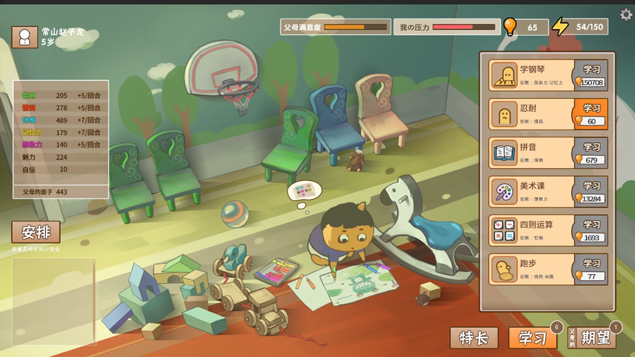 在这个过程中,你要通过“挖脑洞”,“日程安排”等多种方式来提高孩子的各项属性,并让他学会更多的技能。