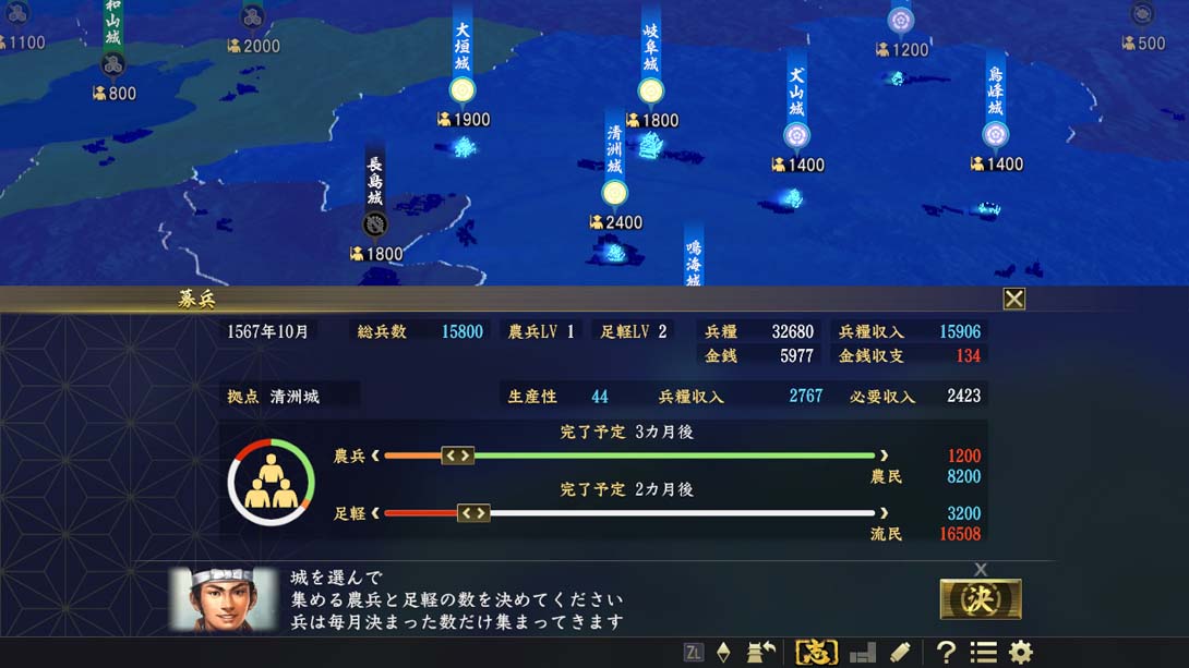 在前作中广受好评的「3D 全国地图」,在本作中更加精细。无论是平原城市还是山城,在全国地图上的城市模型都有表现出其详细特征,更加美丽、真实地描绘出战国时代的日本。