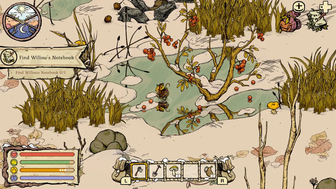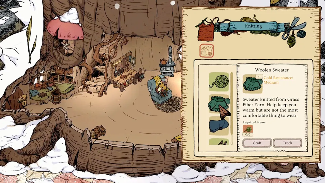 双线玩法:生存与重建并行,需收集枯枝、蘑菇等资源维持温饱,同时修复树洞、制作工具(如斧头、毛衣)。