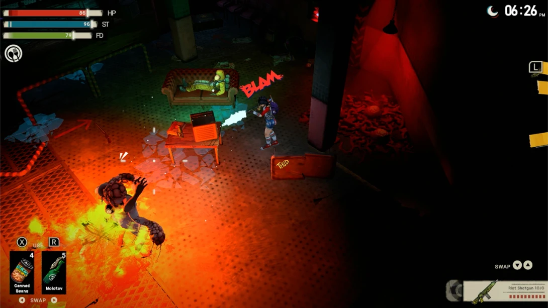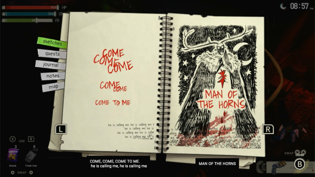 游戏大胆采用复古美漫画风,粗犷线条、浓烈色彩与80年代风情交织,营造出怪诞而迷人的恐怖氛围。更特别的是,声音以视觉化文字呈现:脚步声显示为“沙沙”,篝火爆裂作“噼啪”,仿佛在阅读一本动态漫画,极大增强沉浸感。