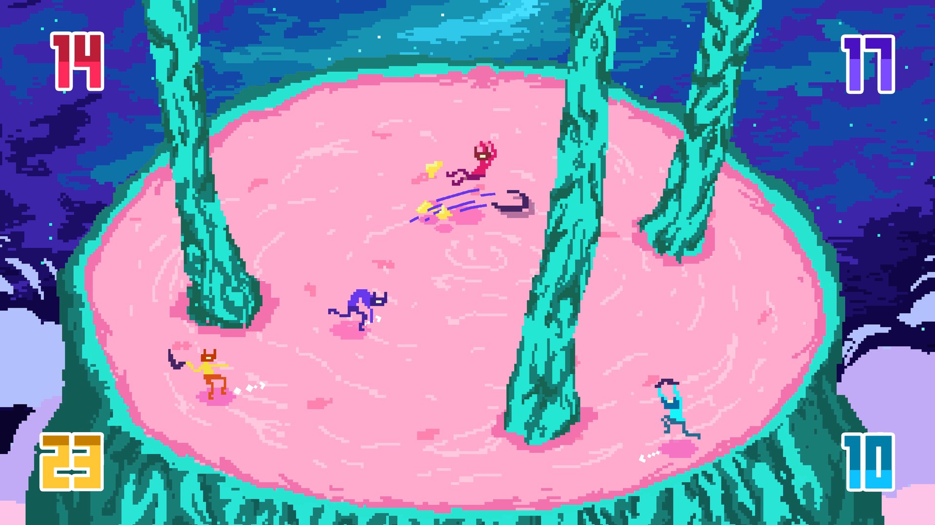 掌握飞旋镖的飞行曲线,以意想不到的方式击中您的朋友,并使他们飞离舞台。在不断上升的平台上战斗,每一轮之后它都会改变其形式。