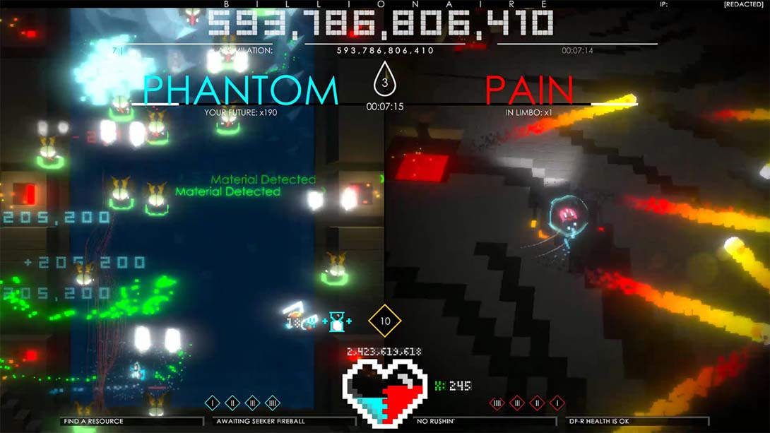 分屏单人游戏双摇杆风险上升 – 您将同时控制两艘船。细节决定成败。左边无敌,但是射击和移动消耗你的LINK。为了恢复它,您必须恢复右侧的 MATERIAL。MATERIAL 会乘以您的总分,因此请务必谨慎使用。在右侧,您正在恢复资源,需要 12 部分来提取和标记您的排行榜位置。不要怀疑自己。强迫自己。你会得到奖励,你会受到考验。