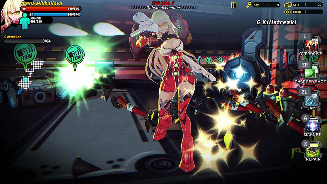 您使用标准攻击和组合攻击与机器人作战。通过粉碎敌人,你可以开辟前进的道路。通过攻击敌人,你可以获得技能点,让你可以一次对大量敌人发动毁灭性的攻击。通关每个关卡后,使用收集到的金币来强化你的角色,让你面对更多的敌人。您还可以使用硬币购买具有各种能力的不同服装。