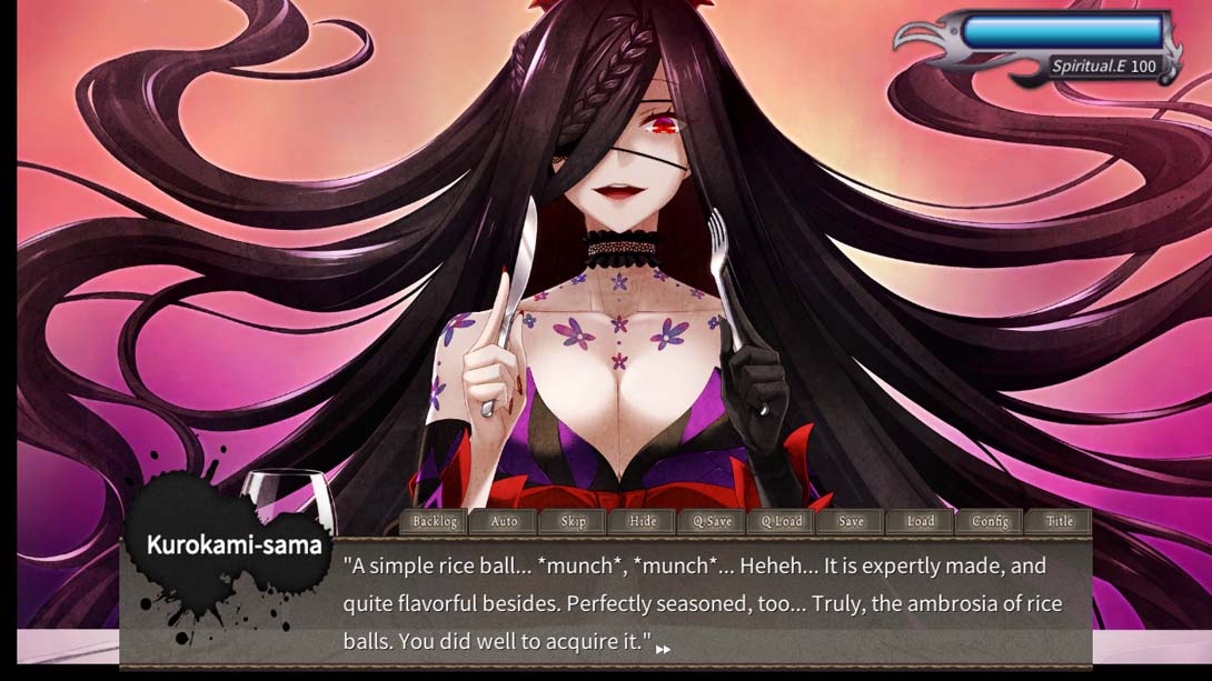 黑神大人残忍而美丽,是强迫主角为她服务的超自然生物。黑神大人希望恢复足够的力量以挣脱束缚她的魔法屏障,命令你从出没于城市的无数怪物那里获取烹饪材料。你会服从她,自己想办法打败她……还是试图勾引她?这是你的选择。