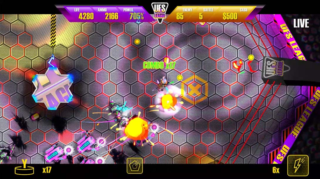 今晚100万美元的人机大战。在12回合内击碎数百个机器人收集奖金和摧毁与上帝的手指的力量。不够吗?激活雷霆,感受毁灭的力量。租用武器并消灭敌人。不要怜悯老板。目标是正确的。演出必须继续。你准备好了吗?UFS联赛是一个充满兴奋的夜晚!