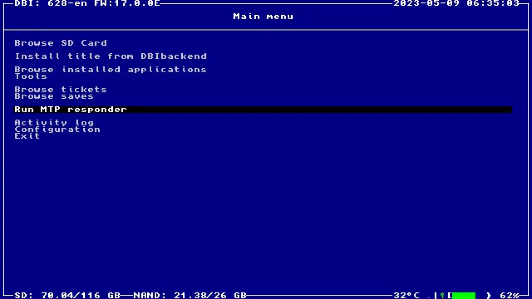 6.选择Run MTP responder按A键确认,进入MTP模式