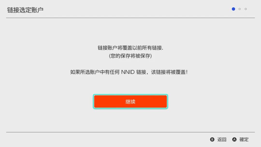 3.稍等几秒,会提示你绑定会清空原有本地账户绑定的其他任天堂账户。点 Continue