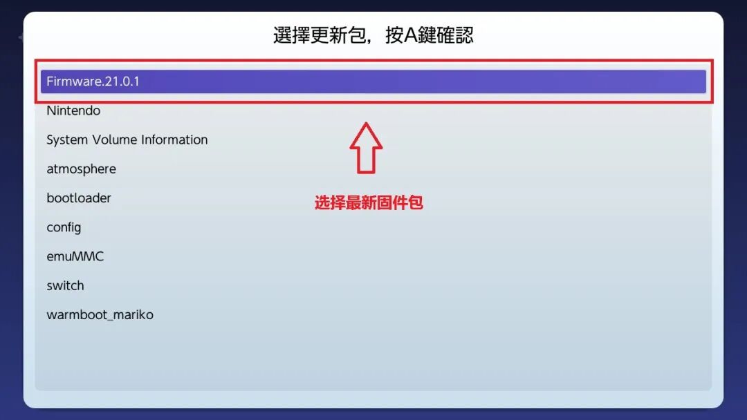 7.选中最新固件选项【Firmware21.0.1】,按 A 确定 ,一定要找对