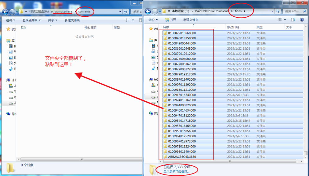 第二步:解压你的金手指压缩包合集!点开titles这个文件夹,进去之后可以看到里面会有非常多的16位字符编号(英文+数字组合)的文件夹,把这些文件夹全选复制,粘贴,(或者拖拽)放到游戏机内存卡atmosphere\contents\这个路径里。
